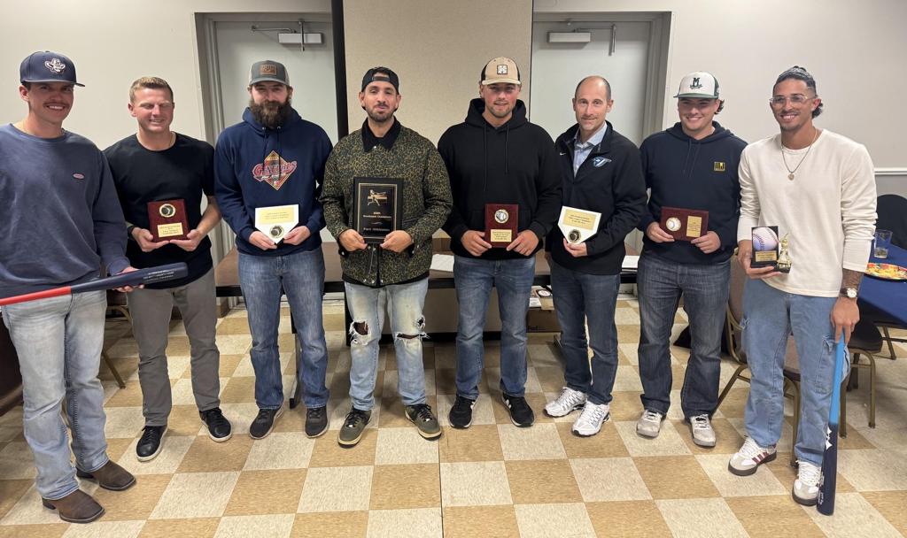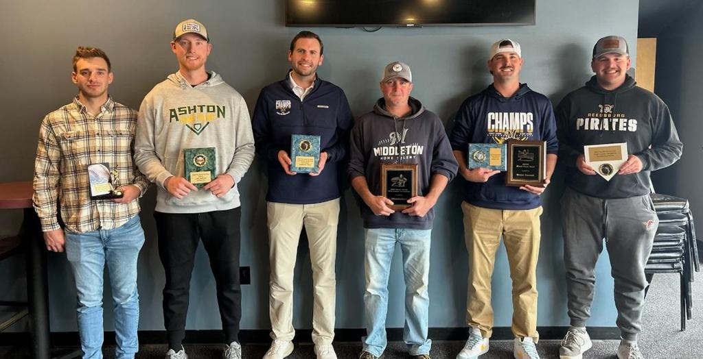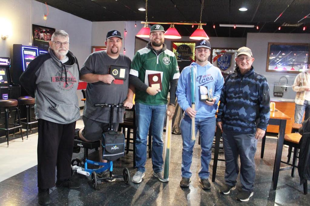 Pat Reilly, HTL President; Nick Larson, Arena Aces co-manager of the year; Drew Schliem, Blanchardville Bullets, co-MVP and leading hitter; Jimmy Jennings, Arena Aces, batting champion; Tom Kammerude, Western Section Representative. Not pictured are West champion and Central NL champion Verona; co-manager of the year and co-pitcher of the year Nate Jennings, Arena Aces; co-MVP James Rae,Verona Cavaliers; and co-pitcher of the year Aydan Williams, Verona Cavaliers.
